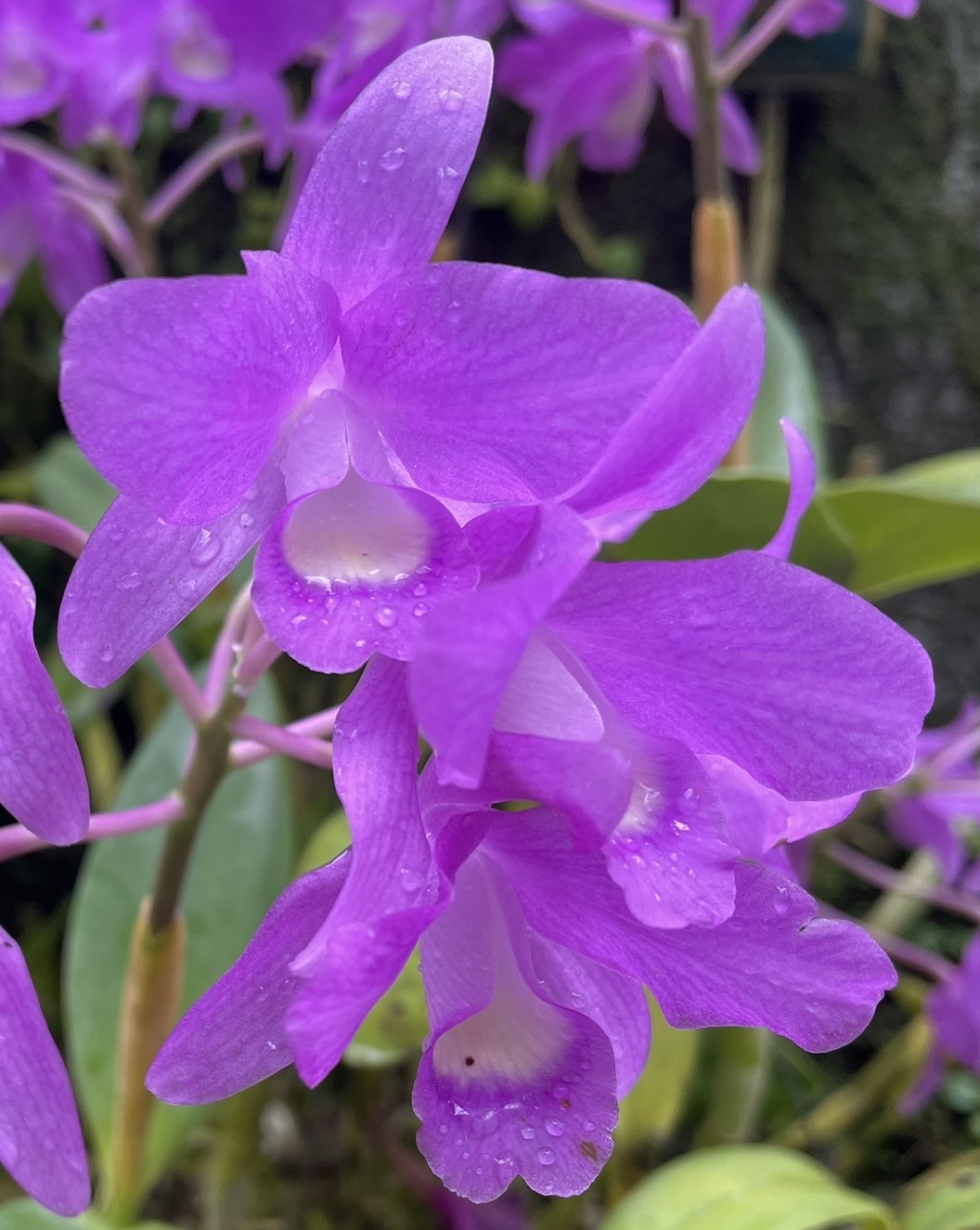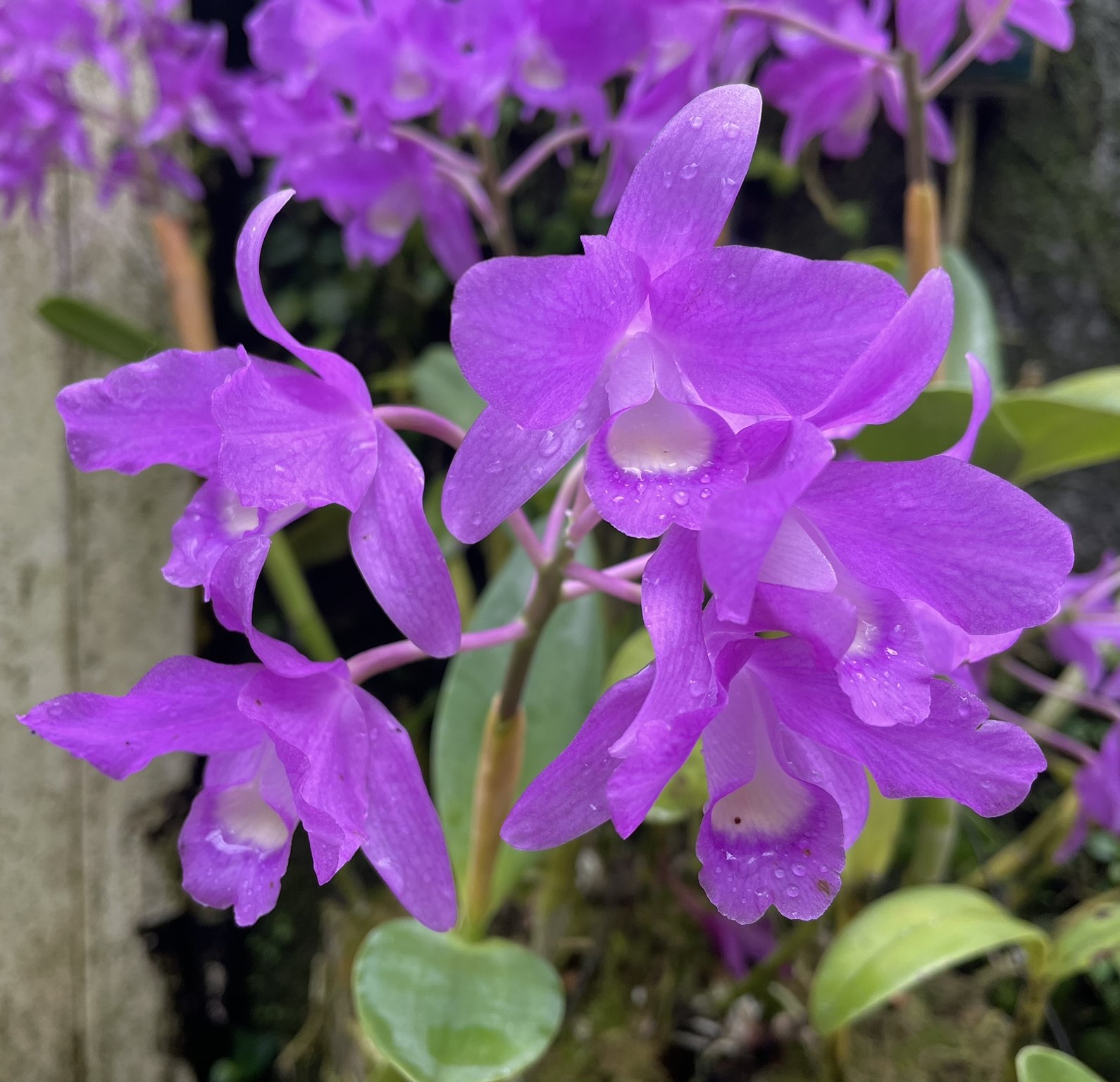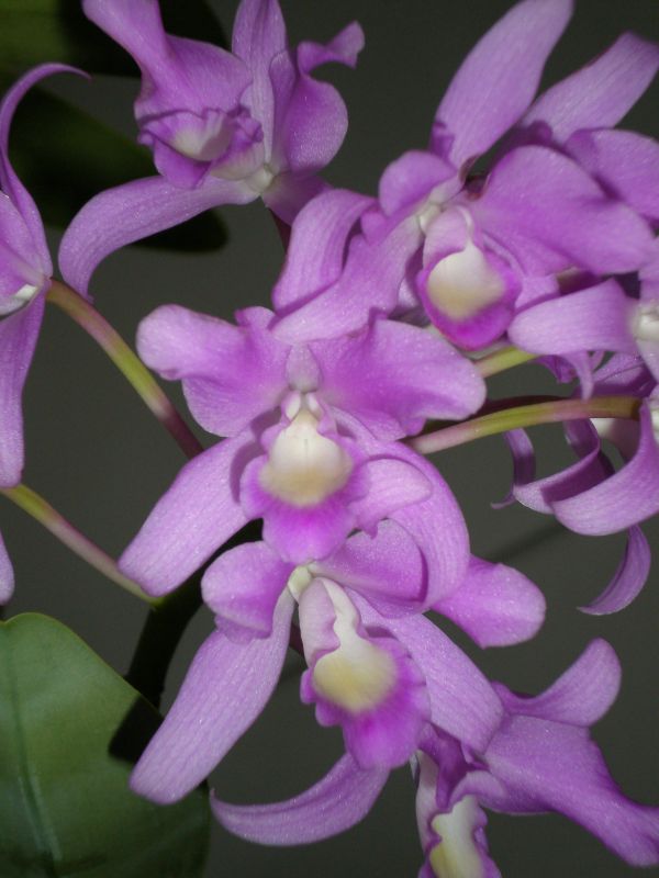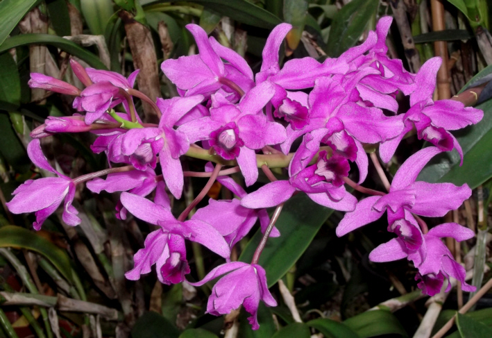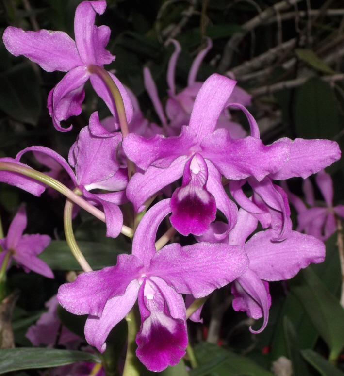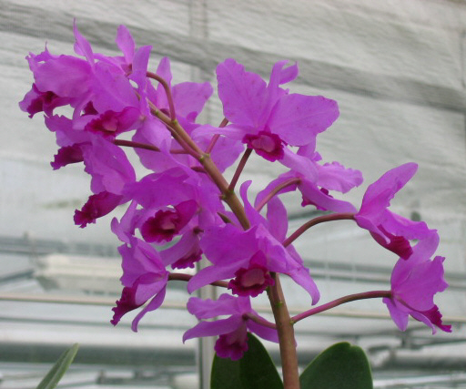 Sie gehört zu den zweiblättrigen Cattleya-Typen und bringt eine üppige Rispe mit mehreren pink-farbenen Blüten hervor.