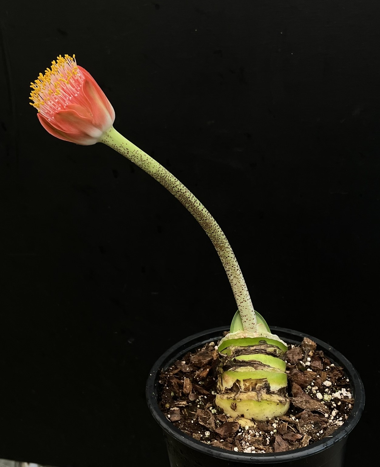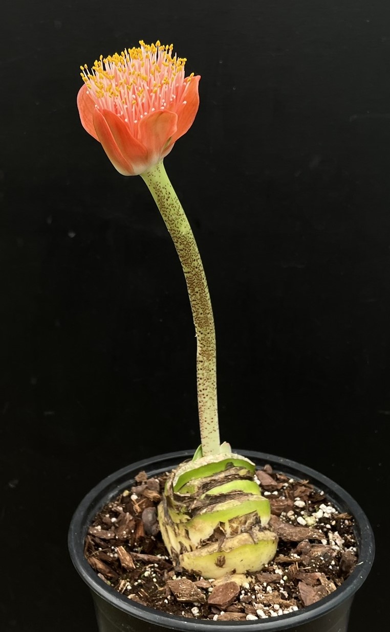 Diese Haemanthus Art verliert ihre Blätter je nach Temperaturen und Wassergabe im Winter bis Frühjahr ihre Blätter. Nach der Blüte im Spätsommer erscheinen die neuen Blätter. Sie erhalten in der laublosen Zeit einen getopfte Knolle in der entsprechenden Größe Ihrer Wahl. Dies ist kein Mangel sondern entspricht der Natur der Pflanze.