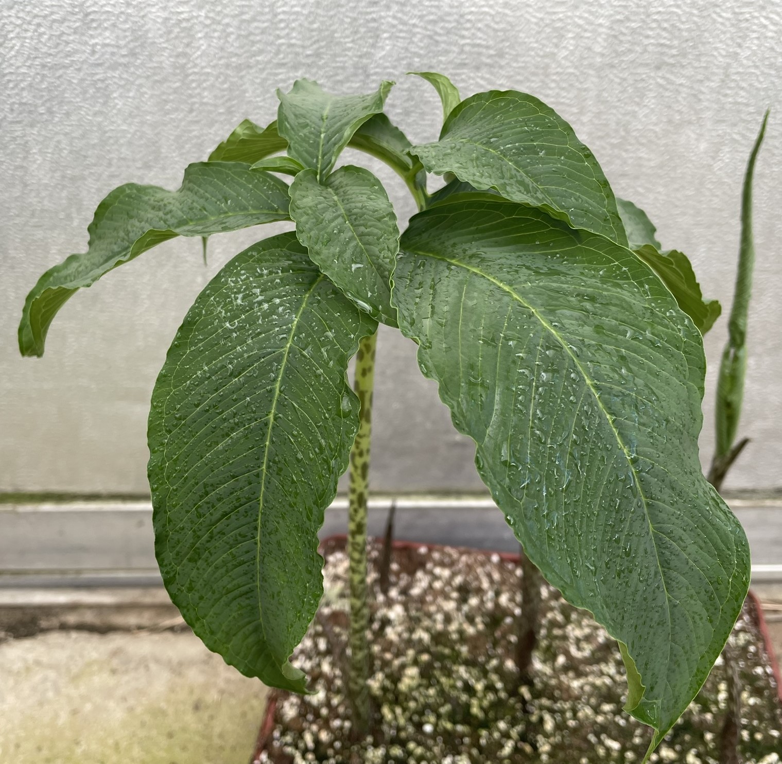 Diese Pflanzen aus der Familie der Aronstabgewächse wird auch "Eidechsenwurz" genannt und stammt aus Asien. Sie ist eng mit Amorphophallus verwandt, bildet wie diese Knollen als Speicherorgene, zieht ihr Laub im Winter ein und entfaltet nach der Ruhe zuerst eine Blüte und danach das gefiederte Laub mit einem auffällig geschecktem Stiel.