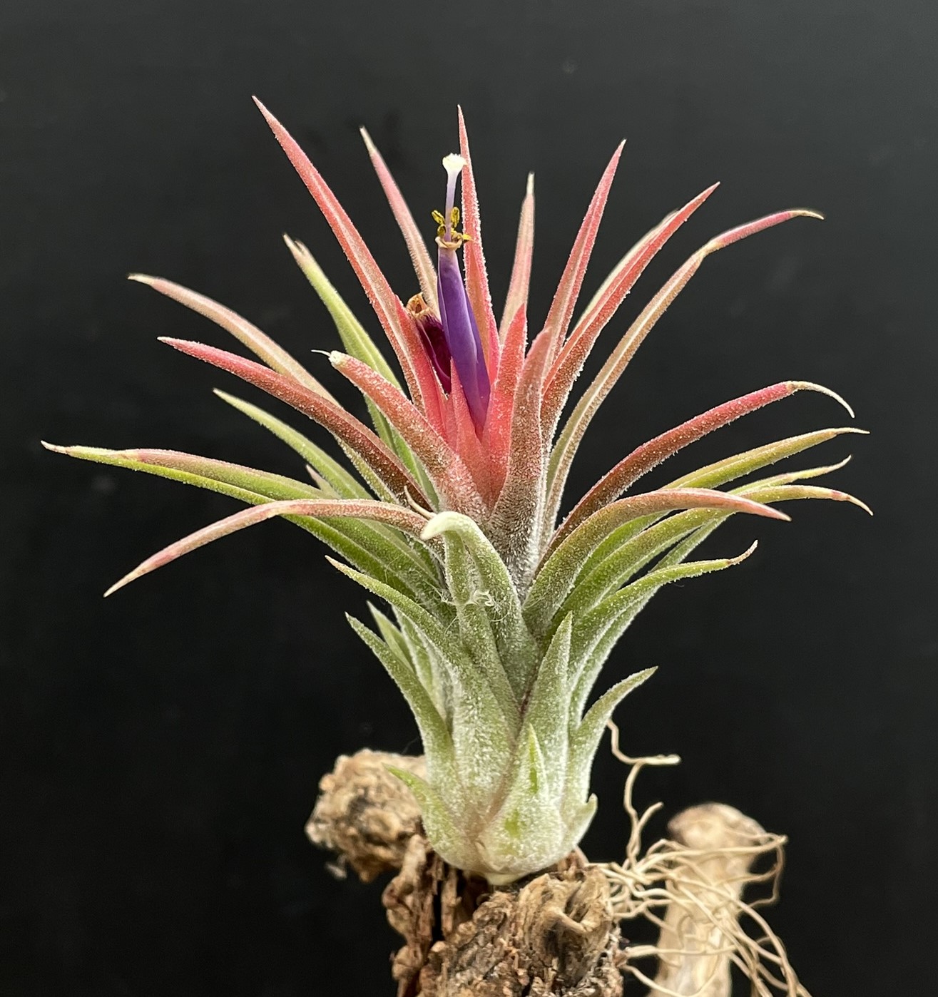 Diese Hybride zwischen T. ionantha ‚Fuego‘ x T. pruinosa hat einen leicht sekunden Wuchs, eine silbrige Beschuppung und rotes Laub während der Blühphase.