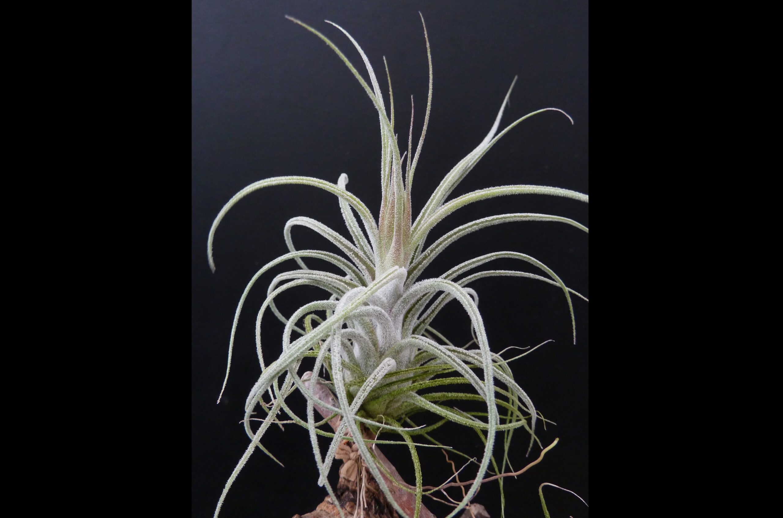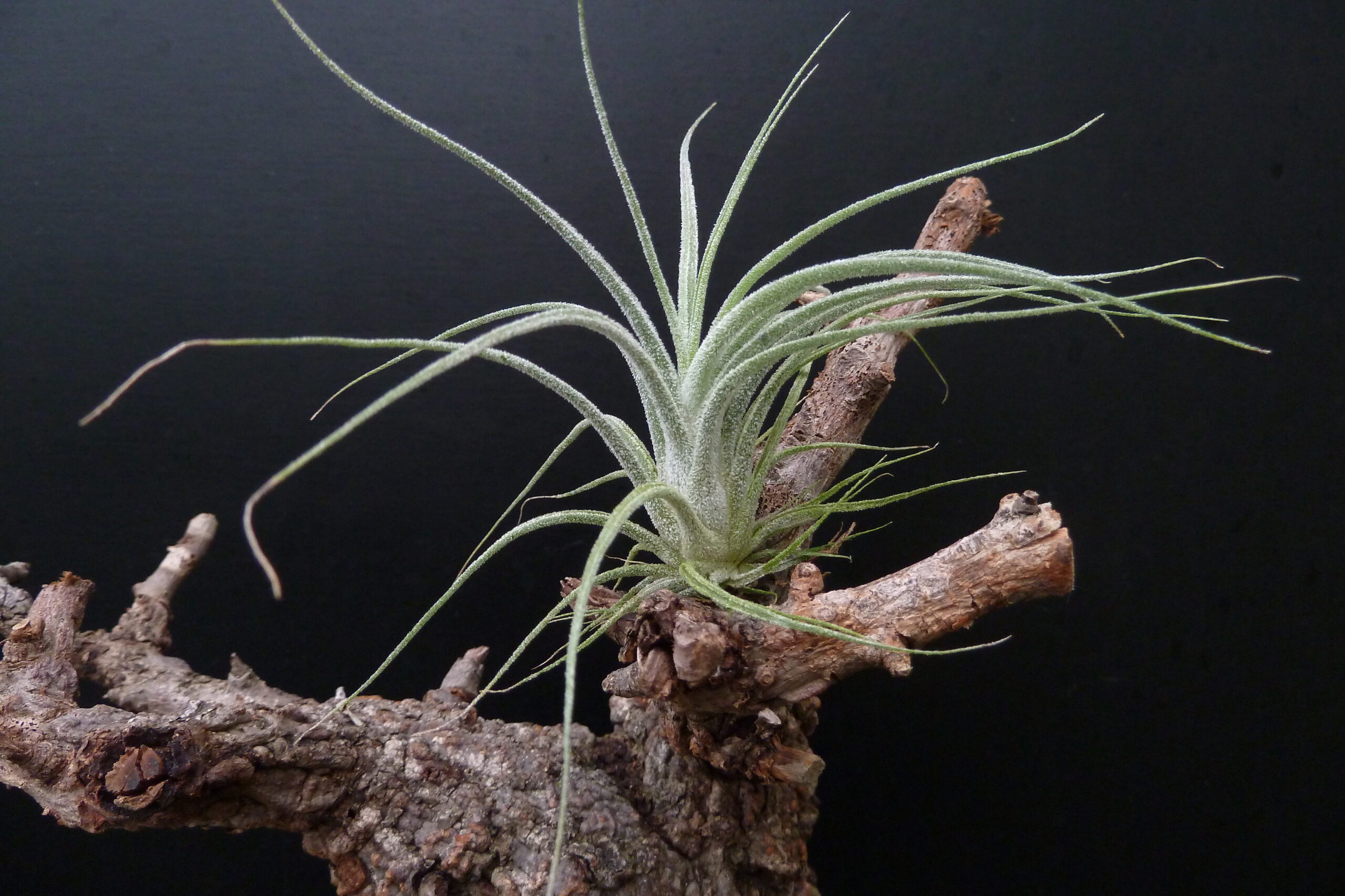 Tillandsia Holm’s Pacaya ist unverkennbar eine Kreuzung zwischen T. pruinosa und T. delicata. Das weiche Laub mit der samtigen, silbergrauen Oberfläche formt eine leicht bulbose Rosette, in der man beide Eltern klar wiederfindet.
